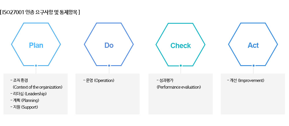 • ISO27001 인증 신청 서류 작성 • 인증심사 대비 교육 • 내부감사 • 인증심사 결함사항 조치지원 |